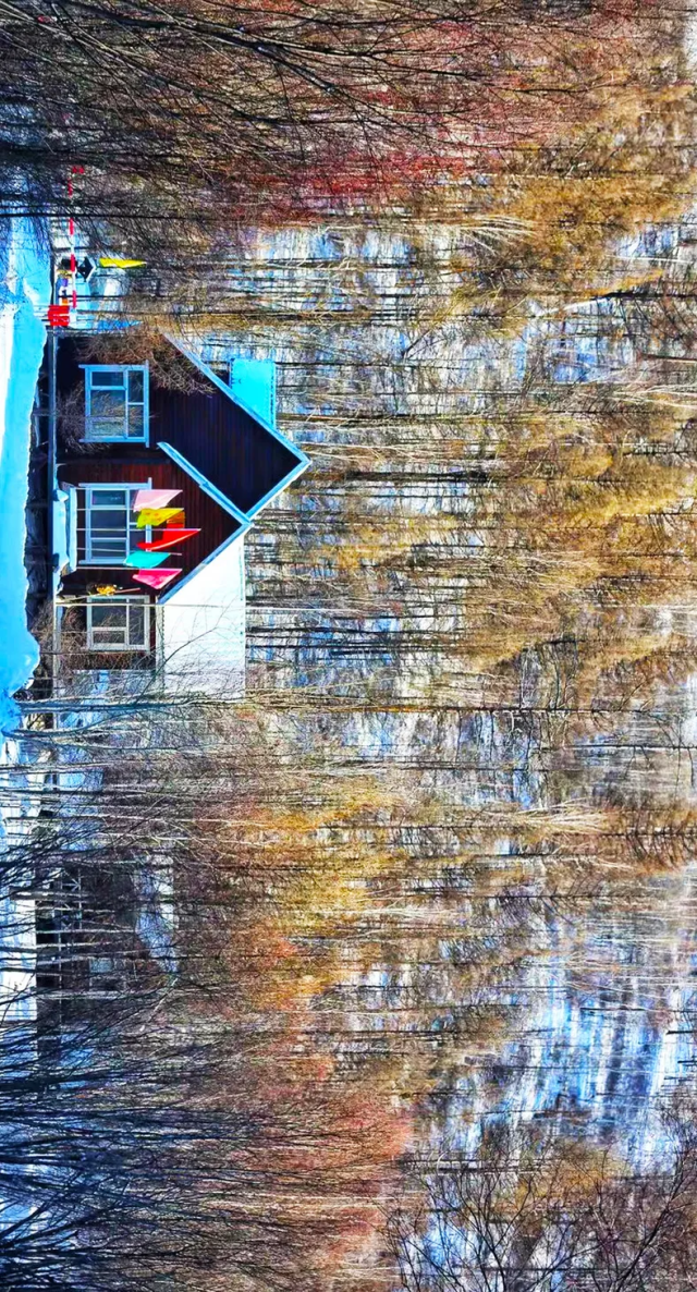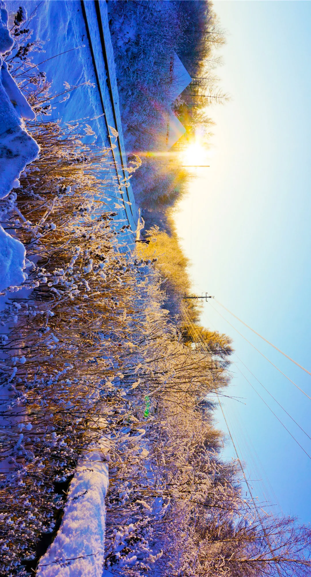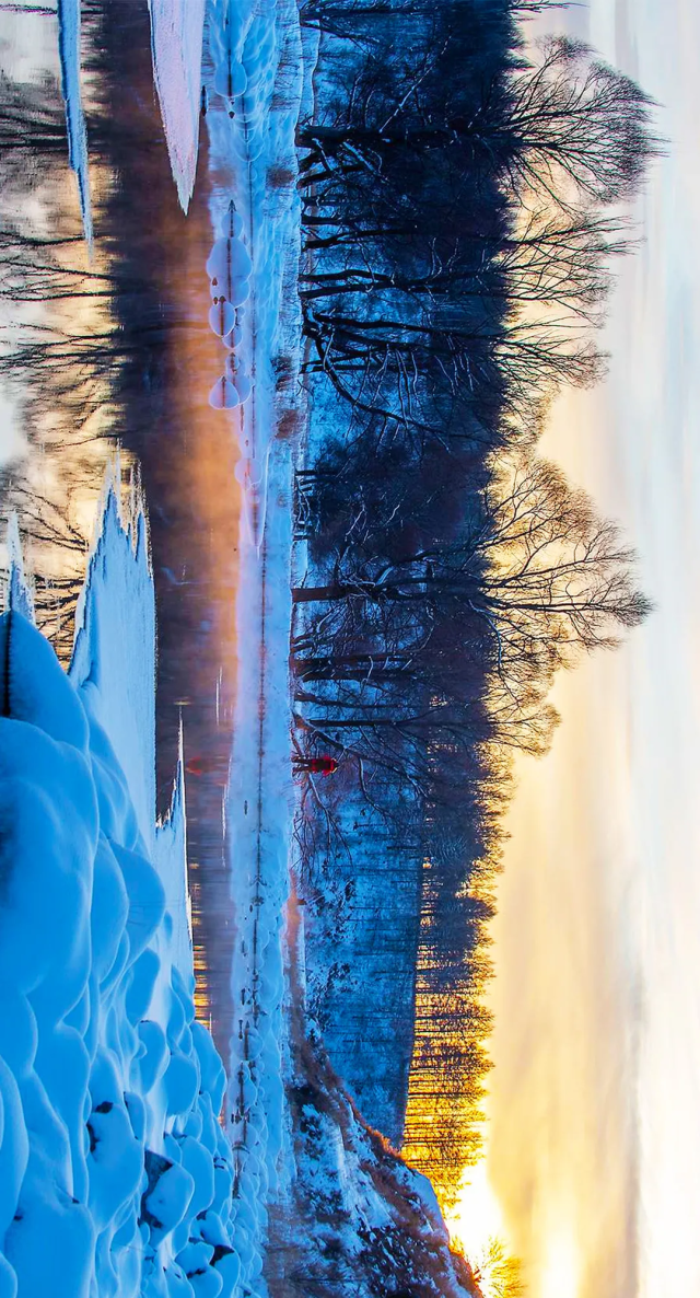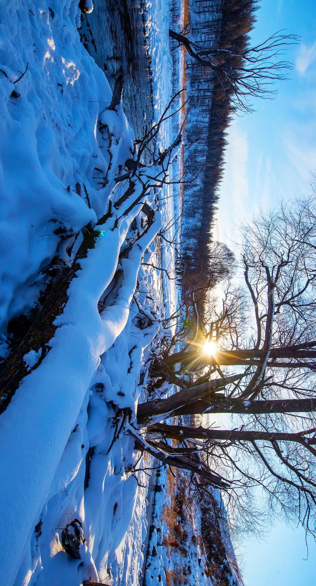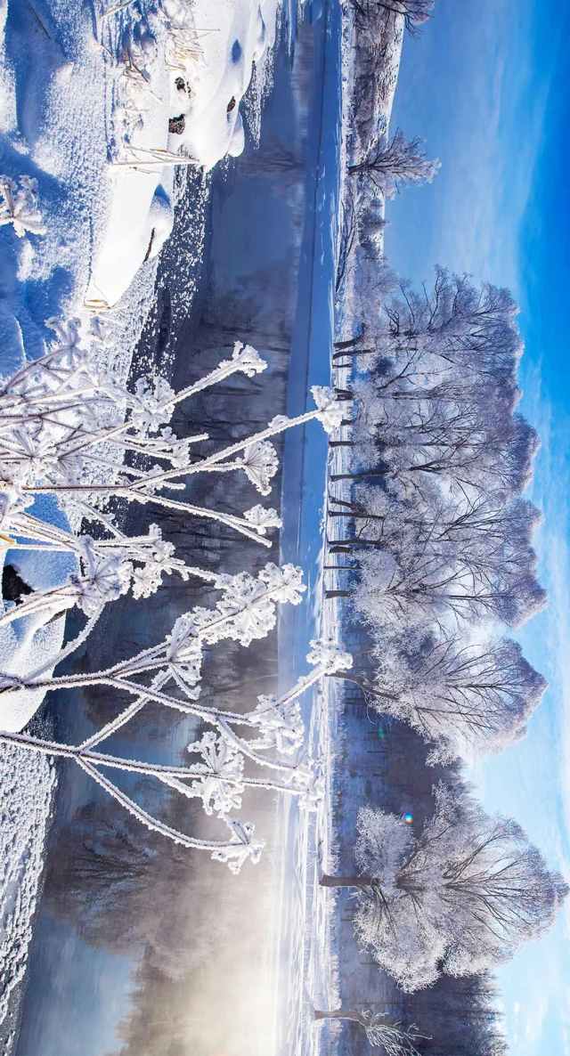 白桦林和灌木形成绝美雾凇,玉树琼花映衬在在蔚蓝天空下,倒映在清澈的河水中,明媚的阳光穿越其中形成璀璨的星芒,不愧是传说中“神仙的居所”。