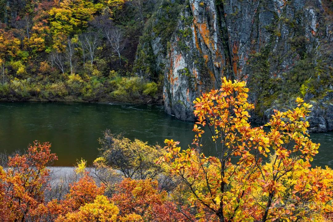 窟窿山下清澈的的诺敏河泛着绿色与周围的色彩形成对比,非常美。