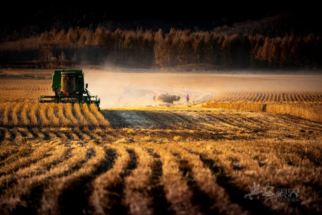 金色大地一派丰收景象,联合收割机正在收割大豆作业,人们把集堆的秸秆和豆皮装上拖拉机运回,作为冬季的烧柴和饲料。