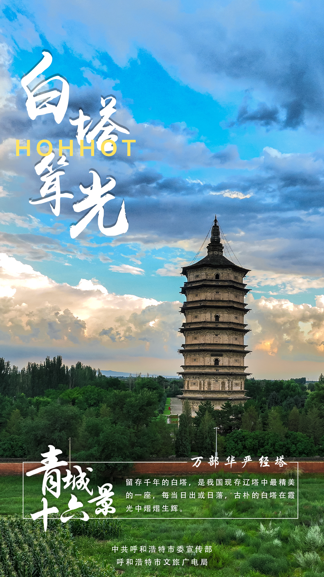 万部华严经塔,建于辽圣宗时期,因塔身涂了白垩土,通体洁白,故俗称白塔。塔高55.5米,是一座八角七层楼阁式的砖木混合塔,是呼和浩特地区现有年代最久,通体最高的古建筑。