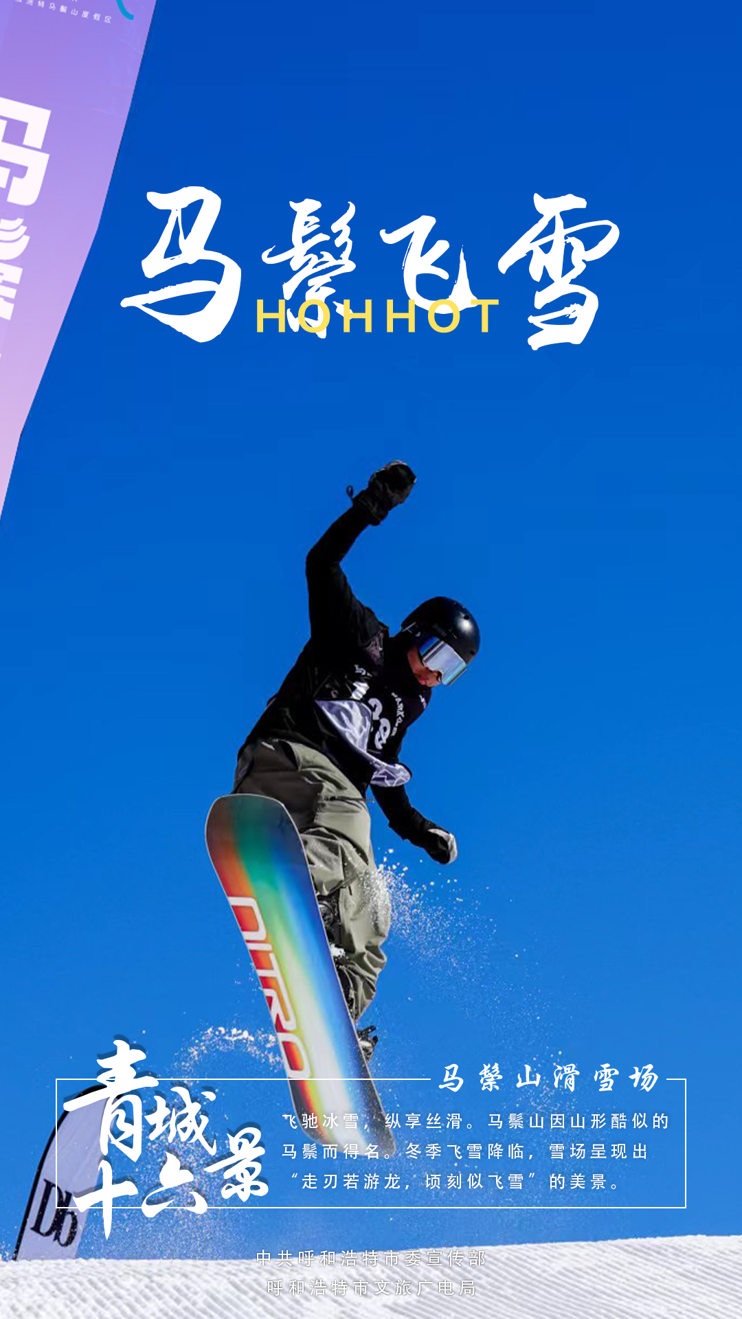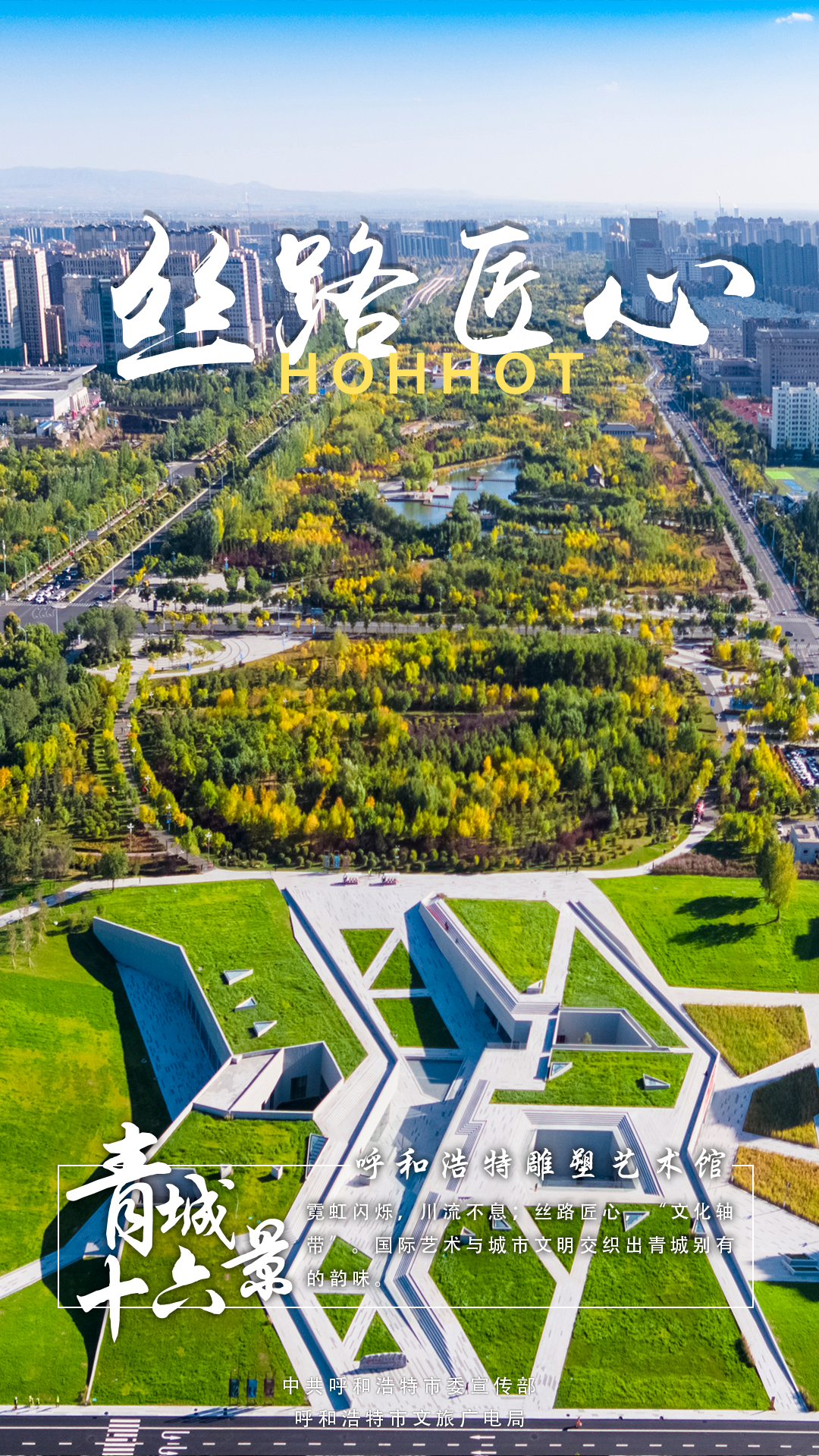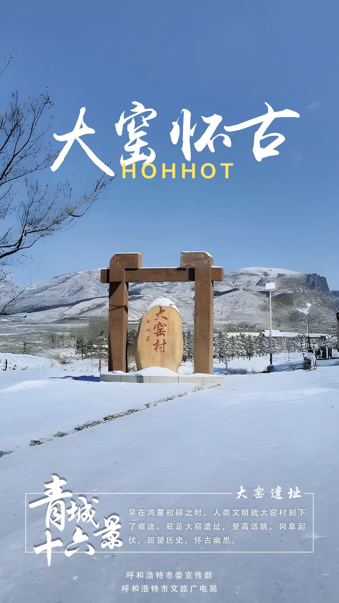 12月15日,“冰雪青城·悦动北疆”呼和浩特市冬季冰雪活动(北京)推介会发布了呼和浩特“青城十六景”。“青城十六景”浓缩了青城16个典型的自然人文景观,它们分别是:大窑怀古、青冢拥黛、白塔耸光、塞上老街、五塔映月、屏藩朔漠、白马访古、丝路匠心、敕勒长歌、神牛回眸、哈素夕照、圣水叠翠、杏坞番红、玉带花海、马鬃飞雪、青山观日。