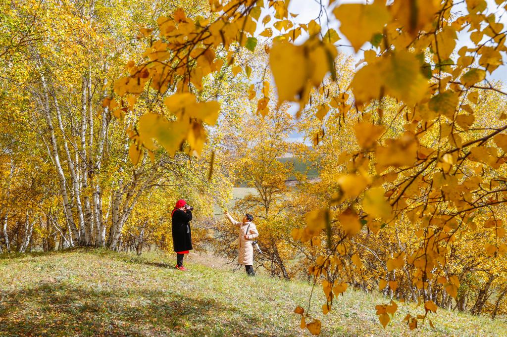 9月21日,游人在河北省承德市围场满族蒙古族自治县坝上草原游玩拍照。