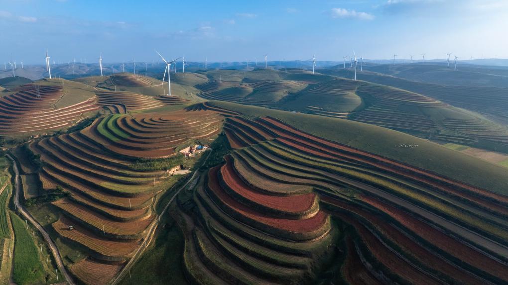 9月21日拍摄的甘肃省庆阳市环县的梯田秋景(无人机照片)。