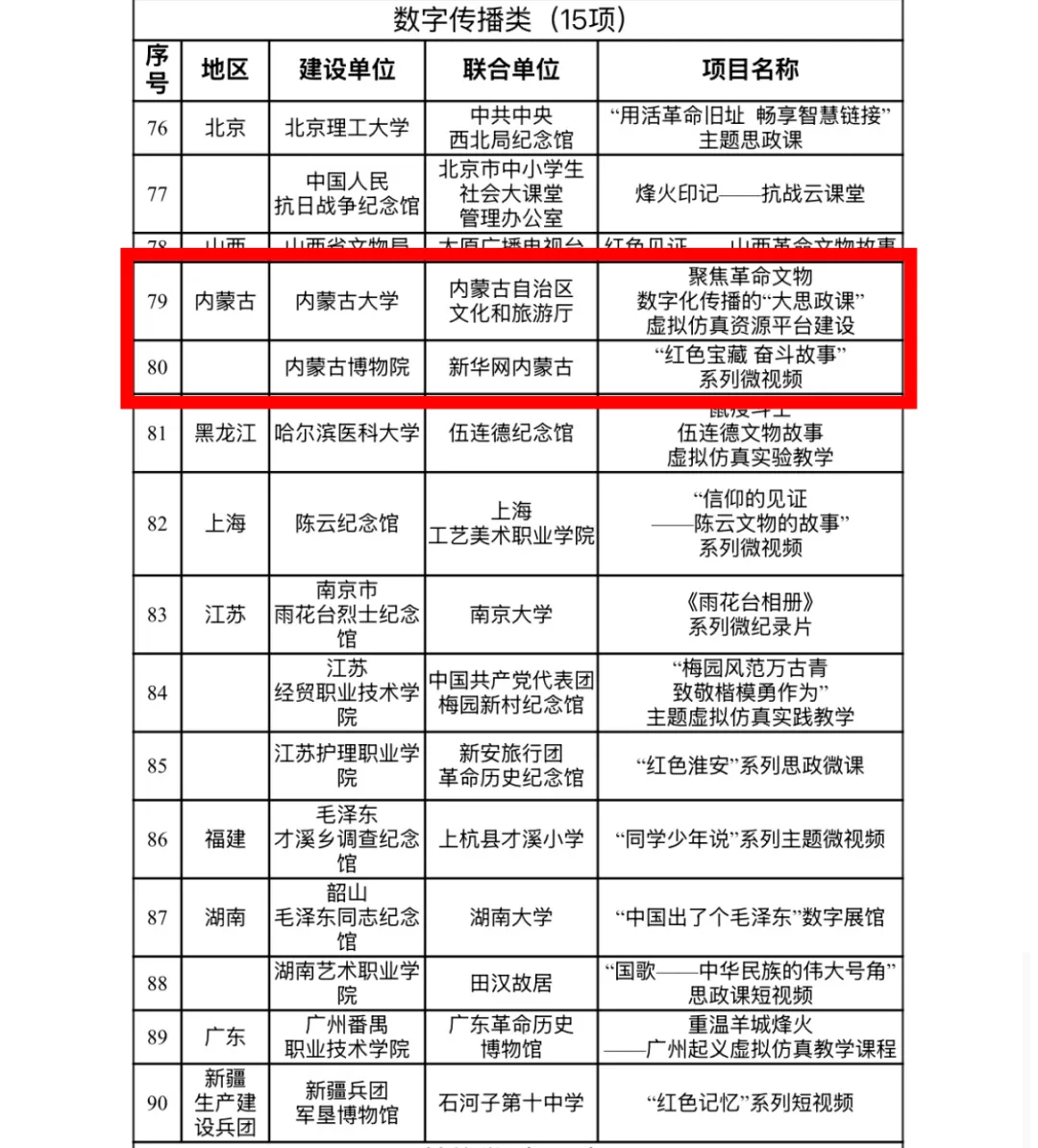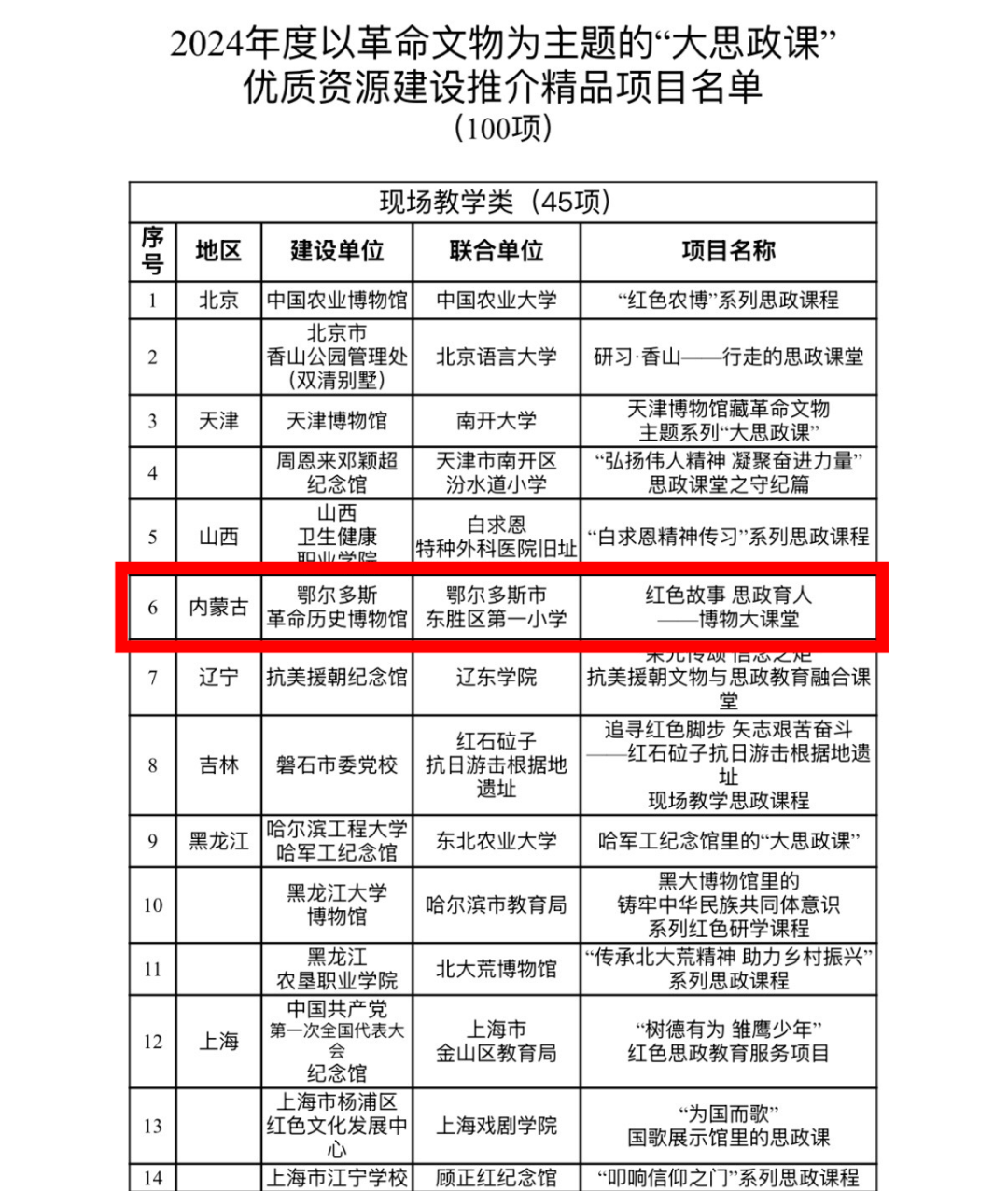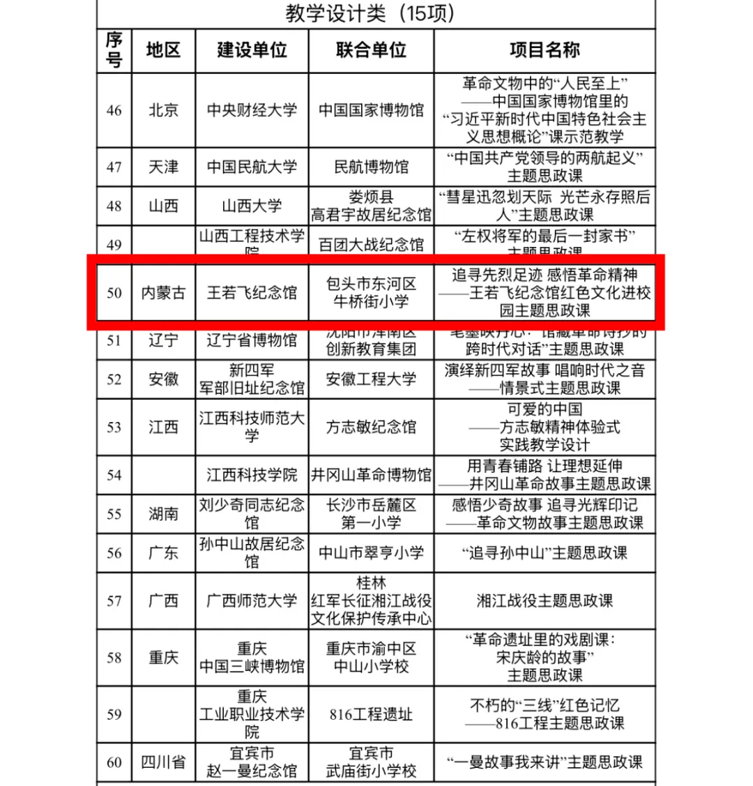 11月6日,国家文物局办公室、教育部办公厅公布了2024年度以革命文物为主题的“大思政课”优质资源建设推介项目名单,最终确定10个示范项目、100个精品项目予以推介。内蒙古4个项目入选全国百强精品推介项目,入选项目数实现翻番。