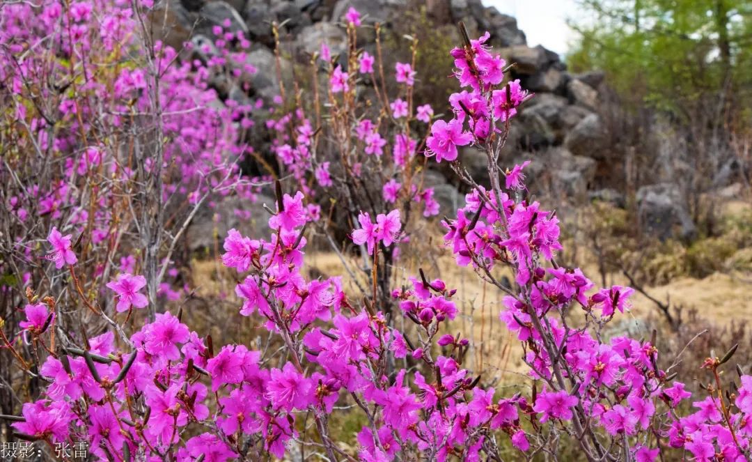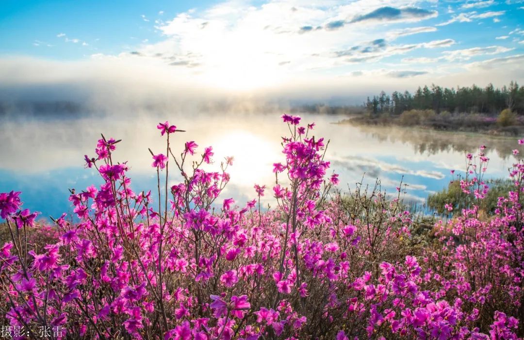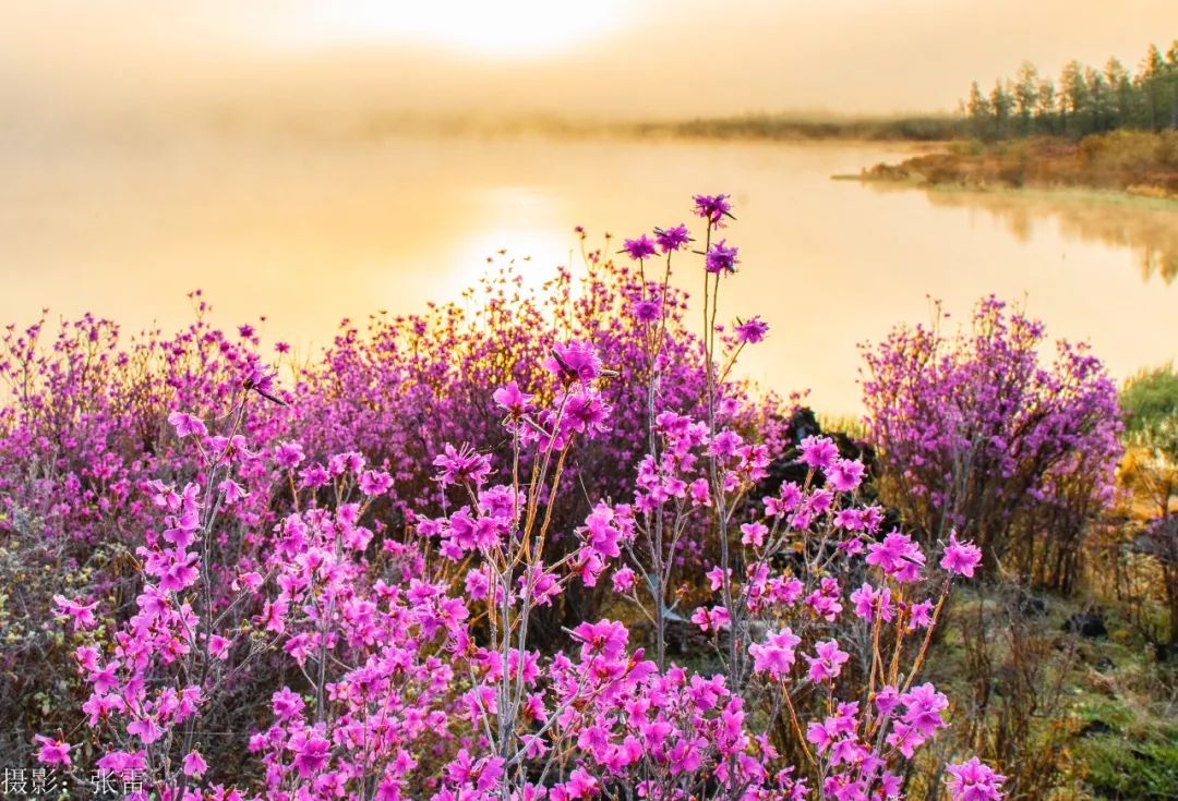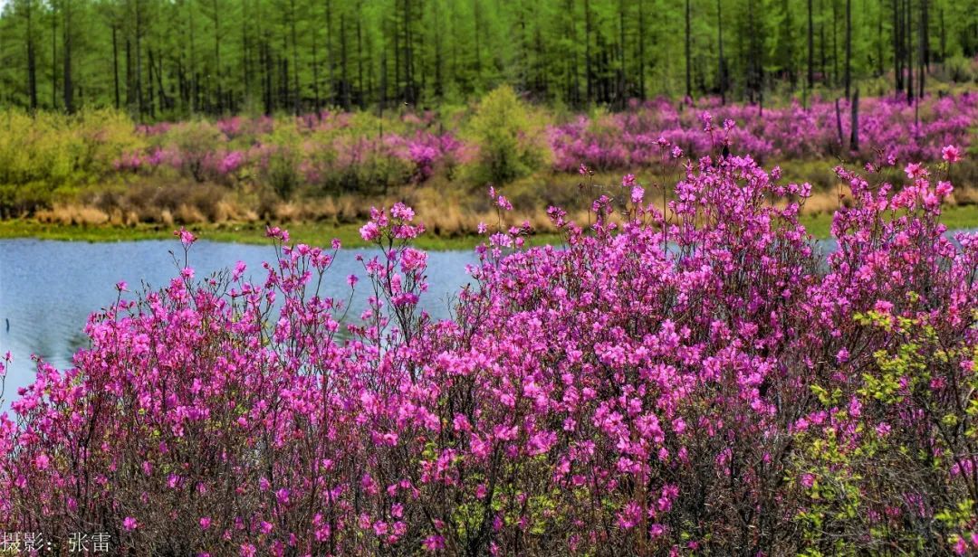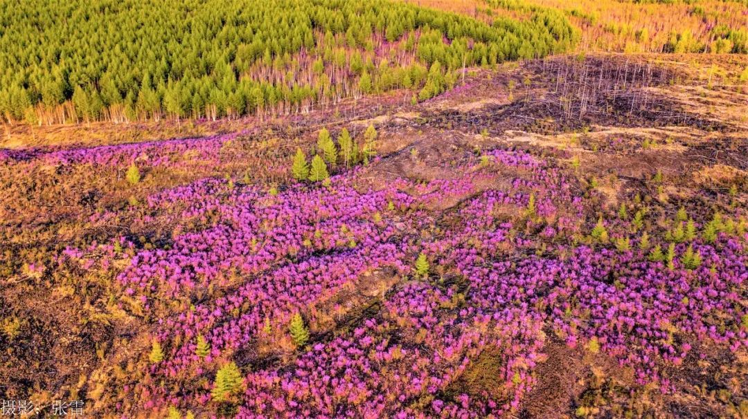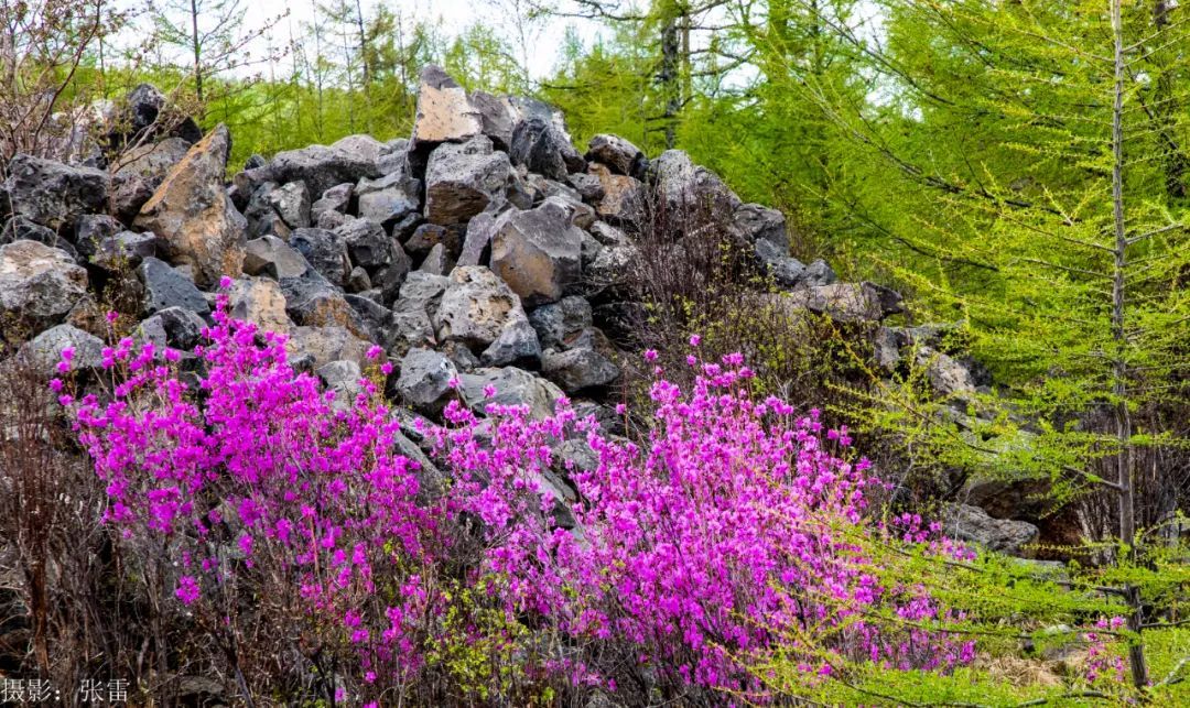 “东风解语拾阶上,吹破熔岩第一春”,五月的风裹挟着残雪掠过熔岩台地,阿尔山的春天便在火山熔岩缝隙里悄然苏醒。千万簇兴安杜鹃挣脱冰壳的桎梏,将沉睡的大地染成流动的胭脂河。这是大兴安岭深处最瑰丽的奇迹 ,是一场关于生命与诗意的交响曲,是一幅大自然的瑰丽画作。