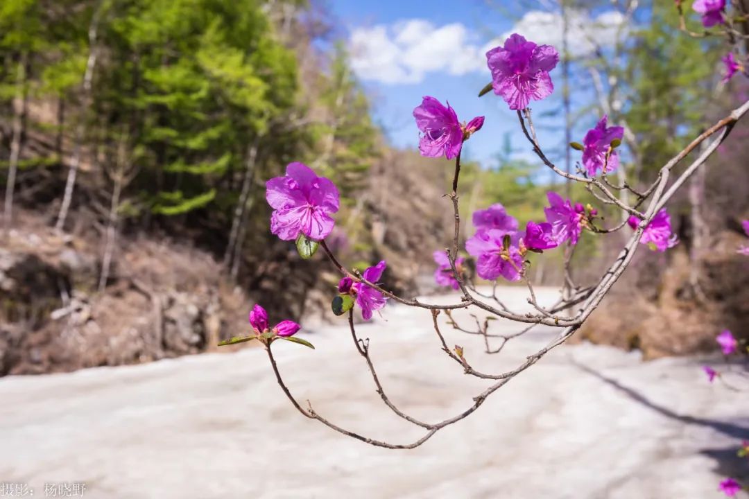 “冰肌映日三分艳,火魄融春一味醇”,好森沟的夏日冰峪,残冰未化的河床旁,杜鹃热烈绽放。冰晶折射着冷冽的光,花瓣流转着温柔的色,冰与火的交界处,冷与暖在此处达成奇妙的平衡,以最热烈的姿态演绎着生命的倔强与绚烂。